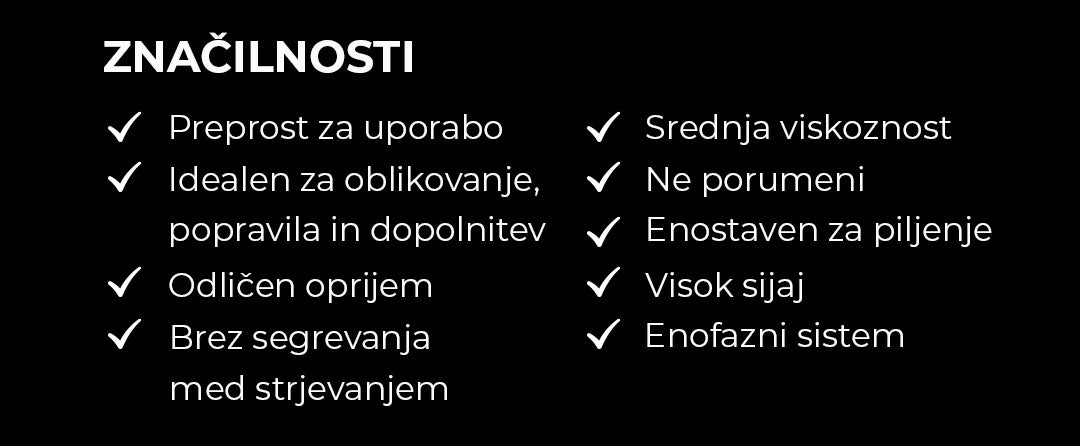 - Samonivelirni enofazni gel z visoko adhezijo in dodatno močjo, zaradi katere je bolj trajnosten za nanašanje tankih slojev,