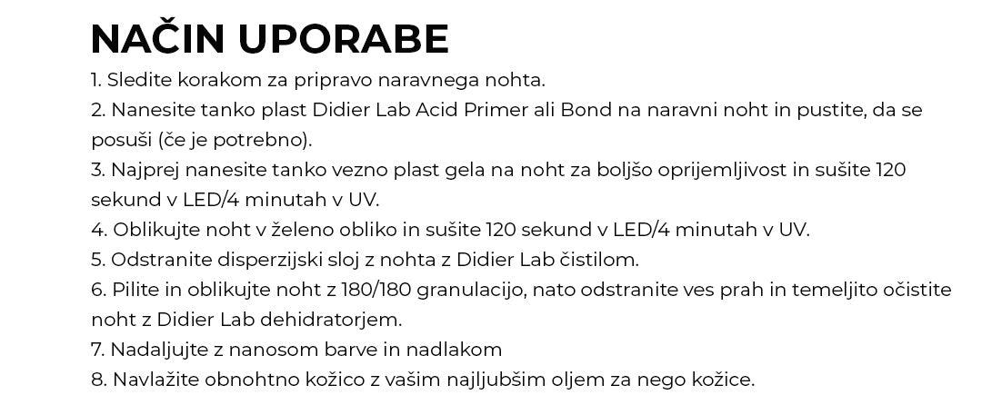 - Pilite in oblikujte noht z 180/180 granulacijo, nato odstranite ves prah in temeljito očistite noht z Didier Lab dehidratorjem.