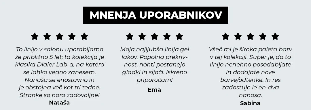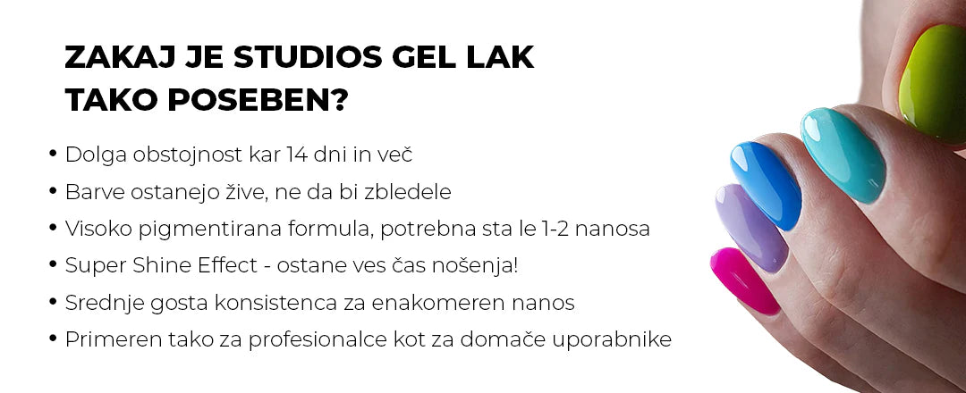 Zahvaljujoč svojim komponentam in lastnostim je ta gel lak zasnovan tako, da ustreza tako začetnikom kot naprednim tehnikom. Hidroksicikloheksil fenil keton, revolucionarna organska komponenta, ki izpolnjuje zakonske zahteve, imenovana tudi "zelena tehnologija", prinaša veliko prednost pri razvoju tega izdelka: takojšnje sušenje pod lučko, velika odpornost na praske in kemikalije ter nizko hlapnostjo.