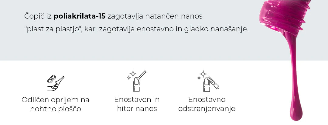 - Hiter in prepros nanos: posebna raztegljiva tekstura tega laka z učinkom tekoče gume v trenutku prekrije nepravilnosti nohta.