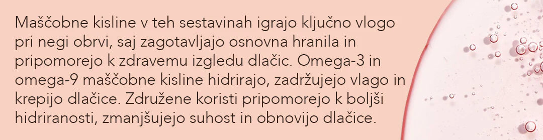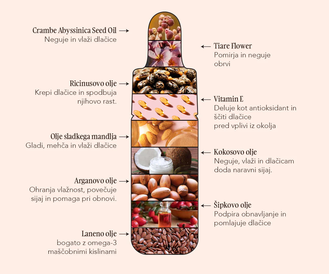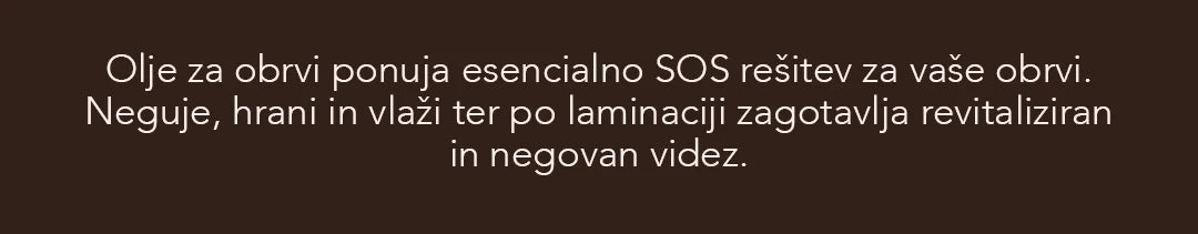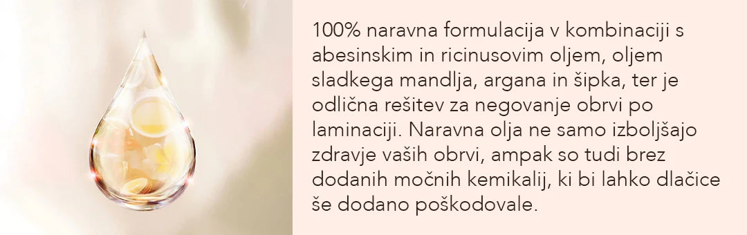 Naj vam predstavimo izredno koncentrirano in 100% naravno formulacijo za vlaženje in obnovo obrvi. To edinstveno negovalno olje je izdelano iz mešanice hranljivih olj lanenega semena, argana, šipka in abesinskega olja, olja sladkih mandljev, polnih esencialnih maščobnih kislin. Te sestavine pomembno vplivajo na presnovo dlak, saj zagotavljajo intenzivno vlago, regeneracijo, pomirjevalne lastnosti in celo zaščitne učinke na kožo po laminaciji obrvi. Poleg tega ta naravna mešanica dela čudeže saj pomaga pri preprečevanju suhosti in lomljivosti dlačic, hkrati pa spodbuja njihovo jakost s pomočjo vitamina E, kar učinkovito zmanjšuje izpadanje las.